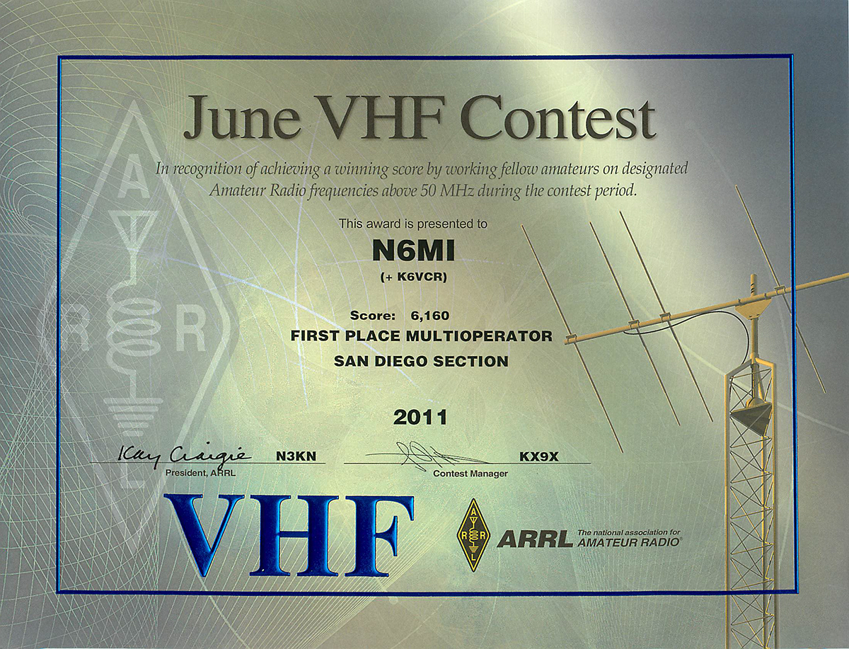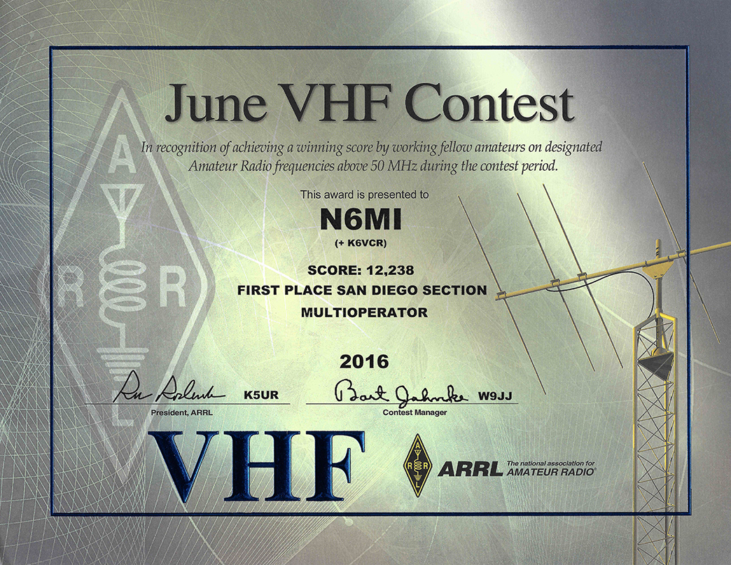 2018June 2018 ARRL June VHF Contest (#1, San Joaquin Valley Section, Single Operator, High Power, Kern County, Mojave Desert, DM15aa) June 2018 ARRL Field Day (1,727 contacts, four operators -- N6MI, K6VCR, KB9FKO, and NB6E in SJV at Tecuya Mountain, Kern County, DM04) July 2018 IARU HF World Championship (AF6O operation in San Bernardino County, DM14, #1 Orange Section, #6 Zone 6 Multi-operator, Single Transmitter, with a team of K6VCR, N6MI and AF6O, at AF6O's high desert station) October 2018 California QSO Party (#1 Ventura County, #11 California, Multiple Operator, One Transmitter, High Power, Frazier Peak, Ventura County, DM04, with N6MI and K6VCR -- 32 degrees at night and one beautiful sunrise on Saturday morning)