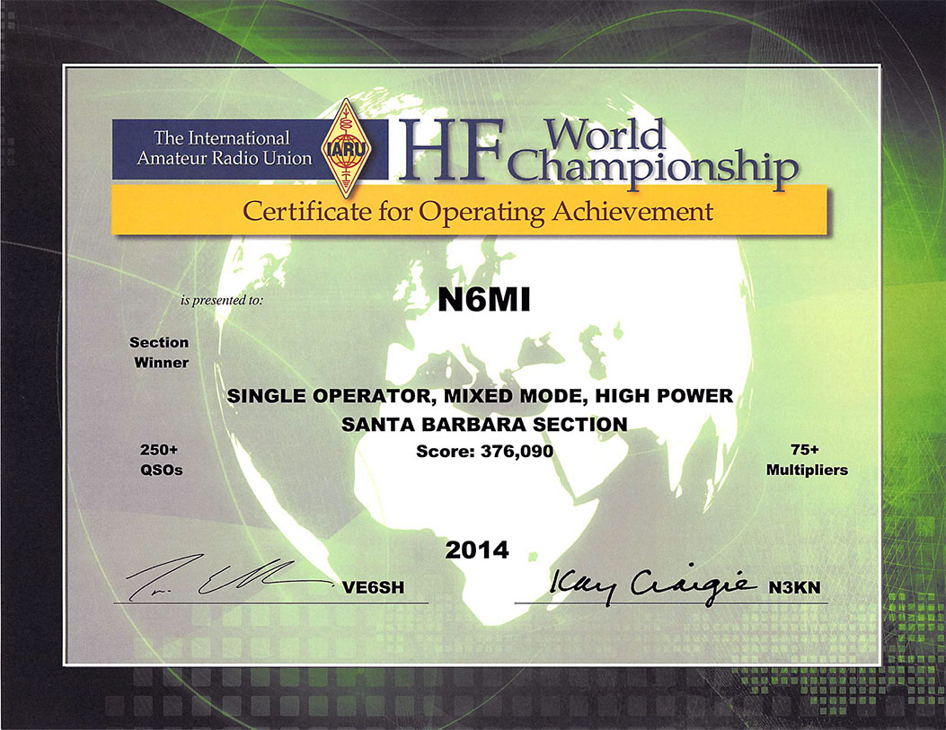 2014May 2014 CQ WW WPX CW (with NB6E at Lake San Antonio, Monterey County, CM95, with a gangbuster vertical and radials on 40 meters, #2 W6 Call Area, Multi-Operator, Single Transmitter, High Power) June 2014 ARRL June VHF Contest (Alvord Mountain, San Bernardino County, DM15, with K6VCR and 34,322 angry killer bees) June 2014 Field Day (3A SCV, Lake San Antonio, Monterey County, CM95) July 2014 IARU HF World Championship (Frazier Peak, Ventura County, DM04, #1 Single Operator, Mixed Mode, High Power, Santa Barbara Section) October 2014 CQ WW DX SSB (Riverside County, DM23, #1 W6 call area, Multi-Operator Single Transmitter) November 2014 CQ WW DX CW (San Bernardino County, DM14, at AF6O's super station, #3 W6 Call Area, Multi-Operator Single Transmitter)