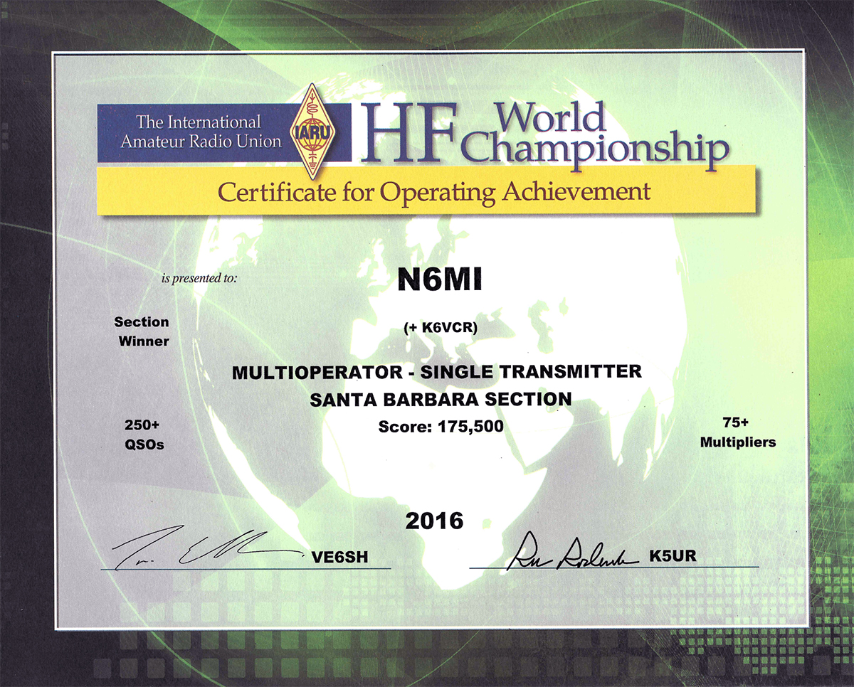 2016March 2016 CQ WW WPX SSB (with K6VCR, at Palomar Mountain, San Diego County, DM13, #3 W6 Call Area, Multi-Operator, Single Transmitter, High Power) May 2016 CQ WW WPX CW (Alvord Mountain, San Bernardino County, DM15, #5 W6 Call Area, Single Operator, High Power) June 2016 ARRL VHF Contest (at Palomar Mountain, with K6VCR, DM13, #1 Multi-Operator, San Diego Section) June 2016 Field Day (with KJ6SSY, at Tecuya Mountain, Kern County, DM04) July 2016 IARU HF World Championship (#1 Santa Barbara Section, Multi-Operator, Single Transmitter, Frazier Peak, Ventura County, DM04, with operators N6MI and K6VCR, and a post-contest SOTA visit from W1ZU) October 2016 California QSO Party (#1 Kern County, #8 California, Multiple-Operator, Single Transmitter, High Power, with K6VCR, 10 miles east of Mojave, Kern County, DM05) March 2017 CQ WW WPX SSB (#2 W6 Call Area, #11 United States, Multiple-Operator, Single Transmitter, High Power, San Bernardino County, DM14, with a team of N6MI, K6VCR and AF6O, at AF6O's high desert station)