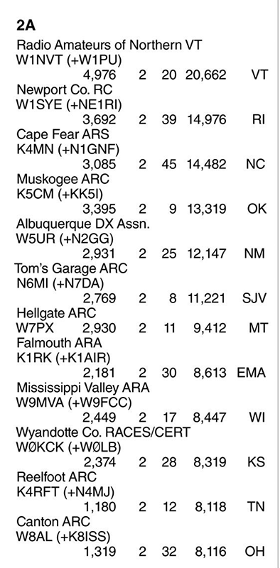 2019May 2019 CQ WPX CW (AF6O multi-op with N6MI and AF6O, San Bernardino County, DM14, 1,573 QSOs and 678 WPX using wire loops and a yagi on the N6MI contest van parked in AF6O's driveway, #13 North America, #9 United States, #1 6th Call Area) June 2019 ARRL June VHF Contest (Tecuya Mountain, Kern County, DM04) June 2019 Field Day (#15 United States, #1 California, Class 2A, Frazier Peak, 8,013 foot elevation, Ventura County, DM04, 1,884 contacts with good food, strong winds, a nice sunrise,a four element 20 meter beam on the van, K6VCR, NB6E, KB9FKO, N6MI and Mr. Broden Weeks). October 2019 California QSO Party (1,088 contacts and 57 multipliers in the N6MI van, at Frazier Peak, Ventura County, DMO4, with AF6O, N6MI, a fresh N7DA, and N7DA late at night in the cramped operating position -- Multi-Single High Power, #7 California, #4 Mult-Single Expedition, #1 Ventura County).