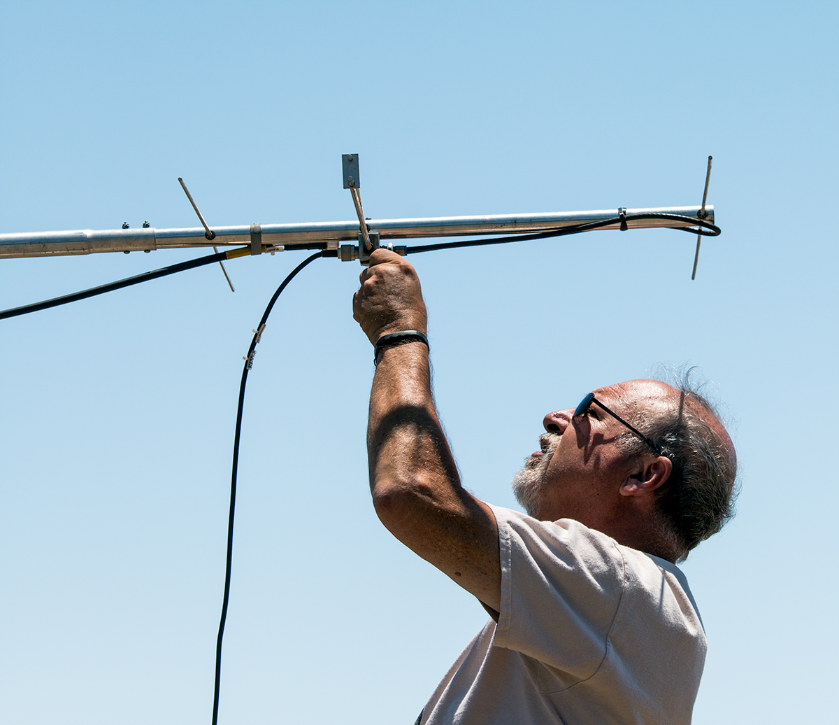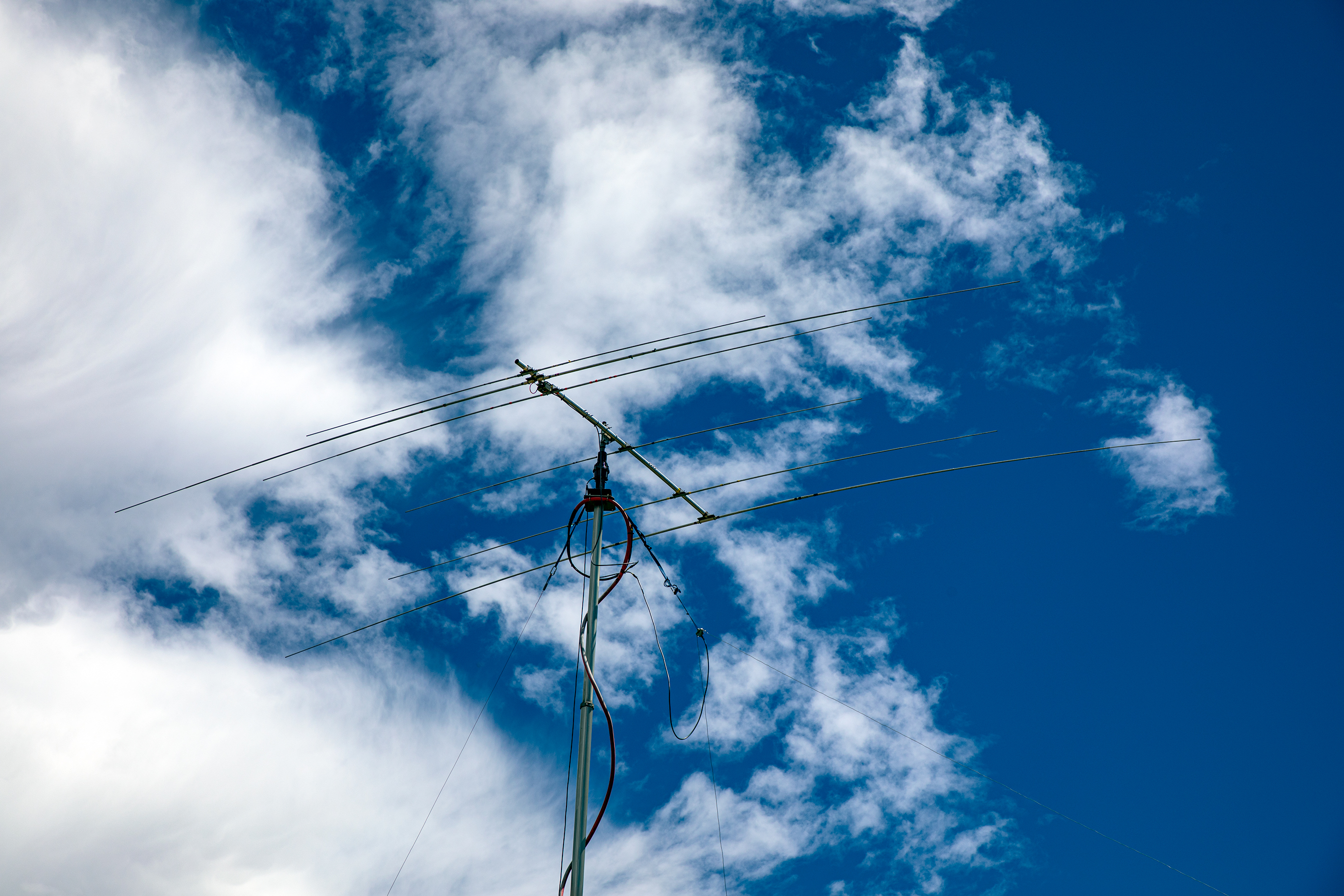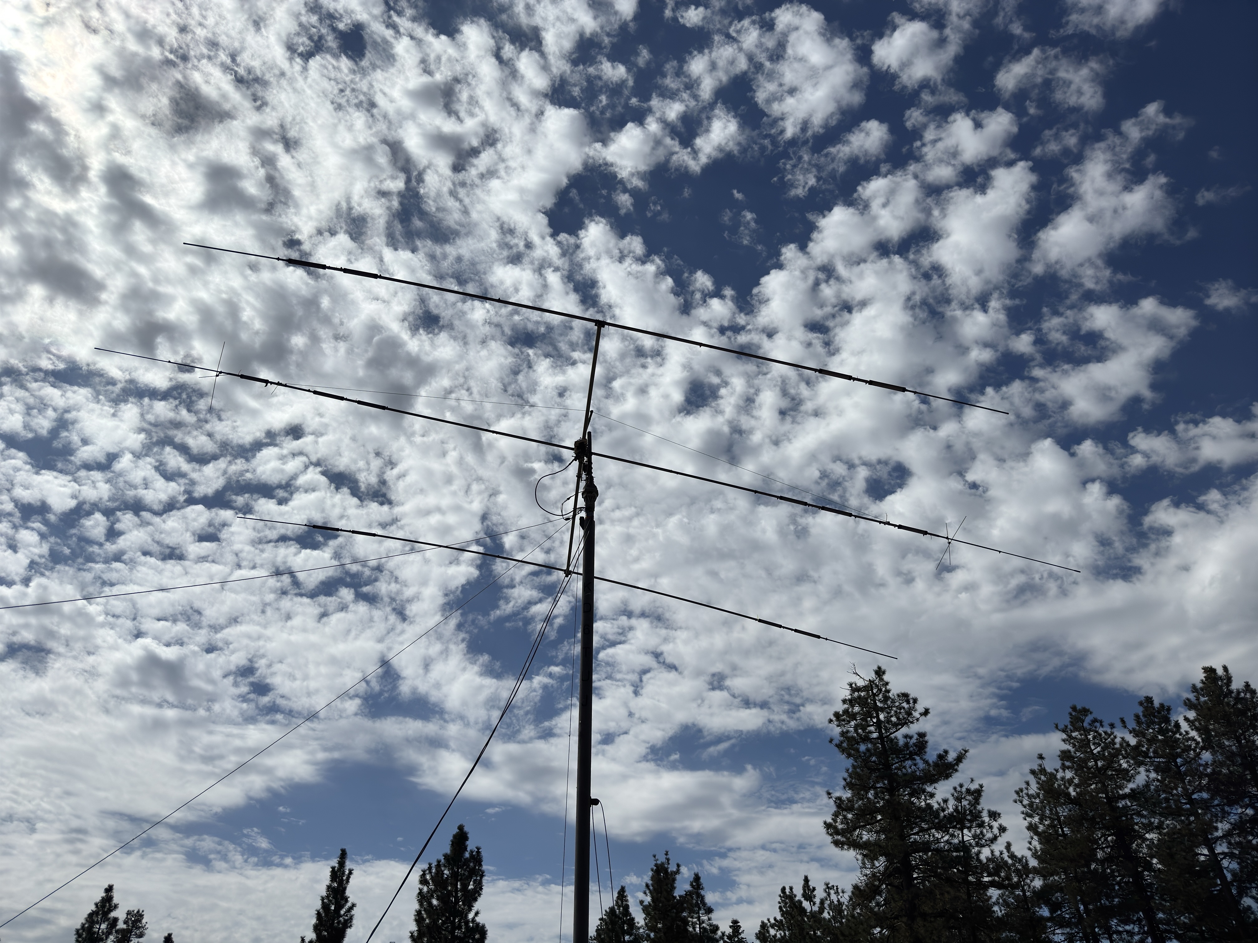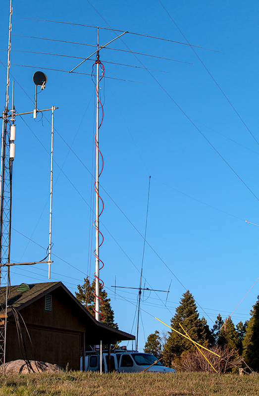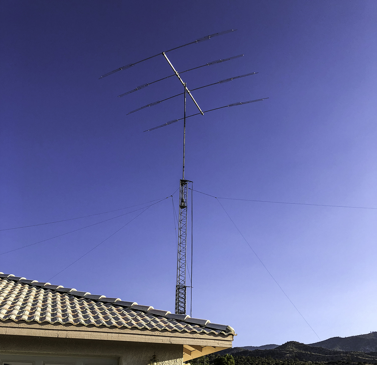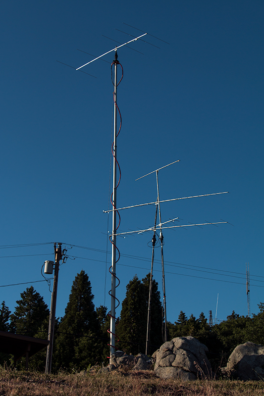 I used a: 5 element Yagi on six meters at 60 feet (500 watts); 14 element Yagi on two meters at 20 feet (100 watts); 18 element Yagi on 432 MHz at 15 feet (75 watts); and a 22 element Yagi on 1296 MHz at 10 feet (10 watts).