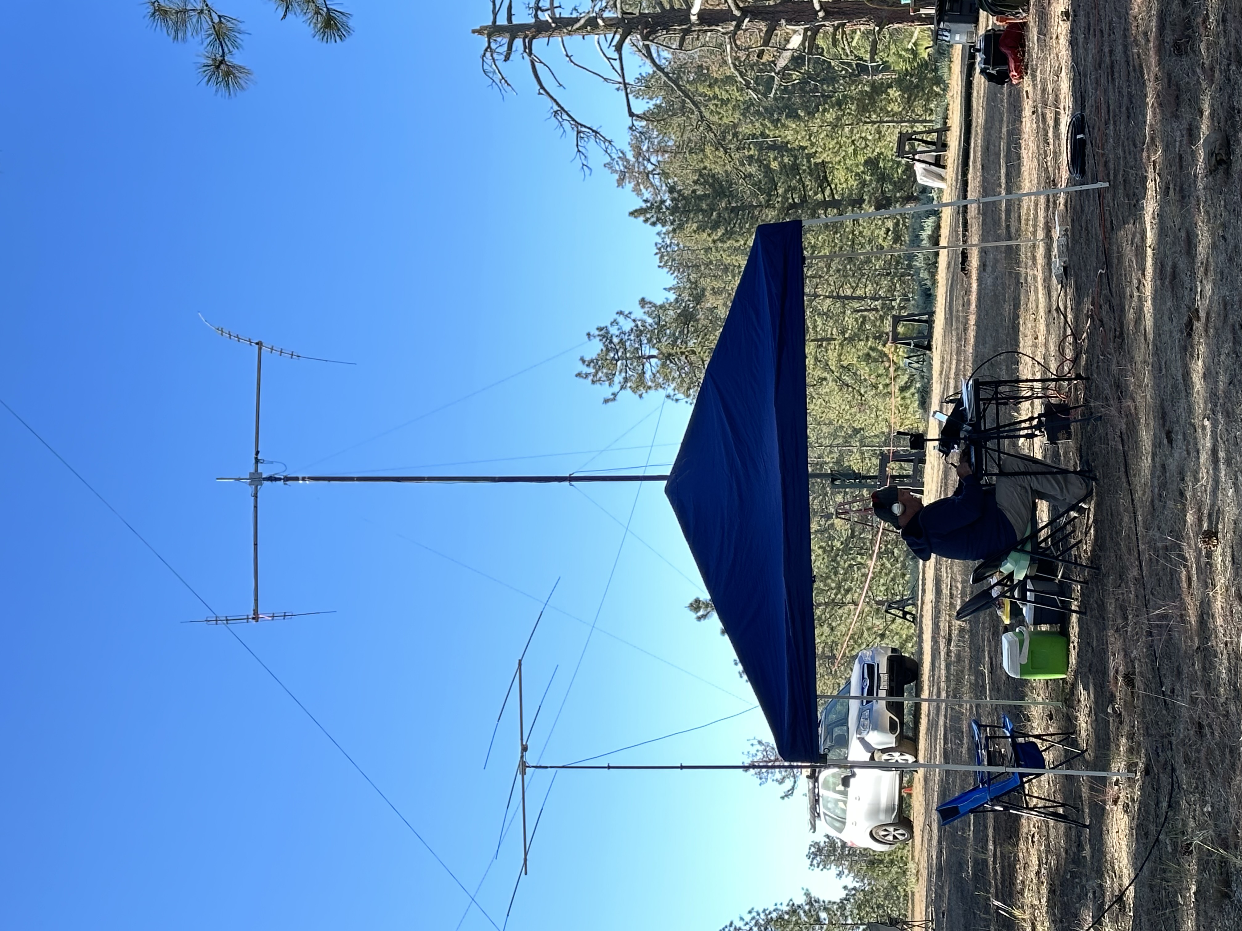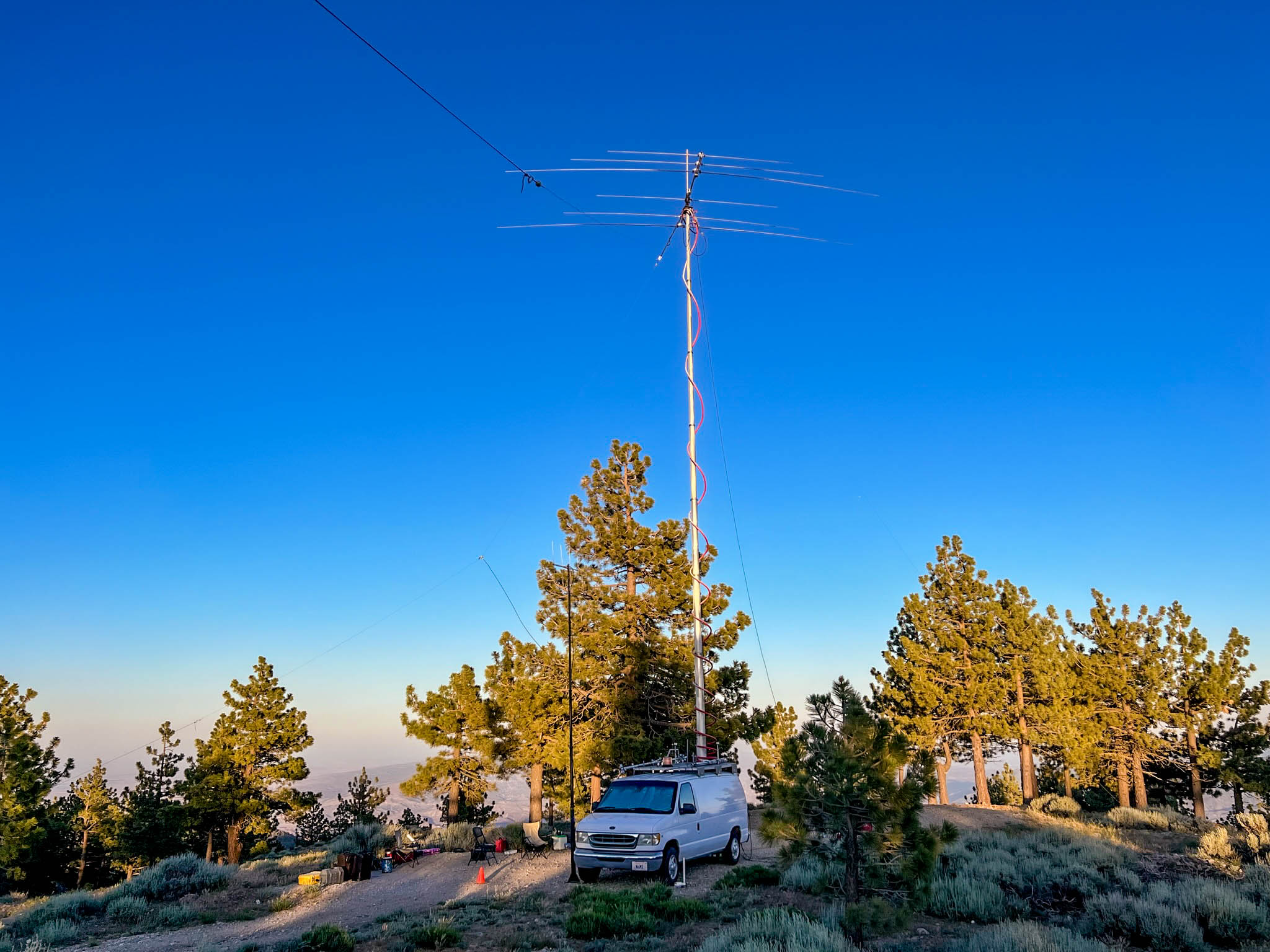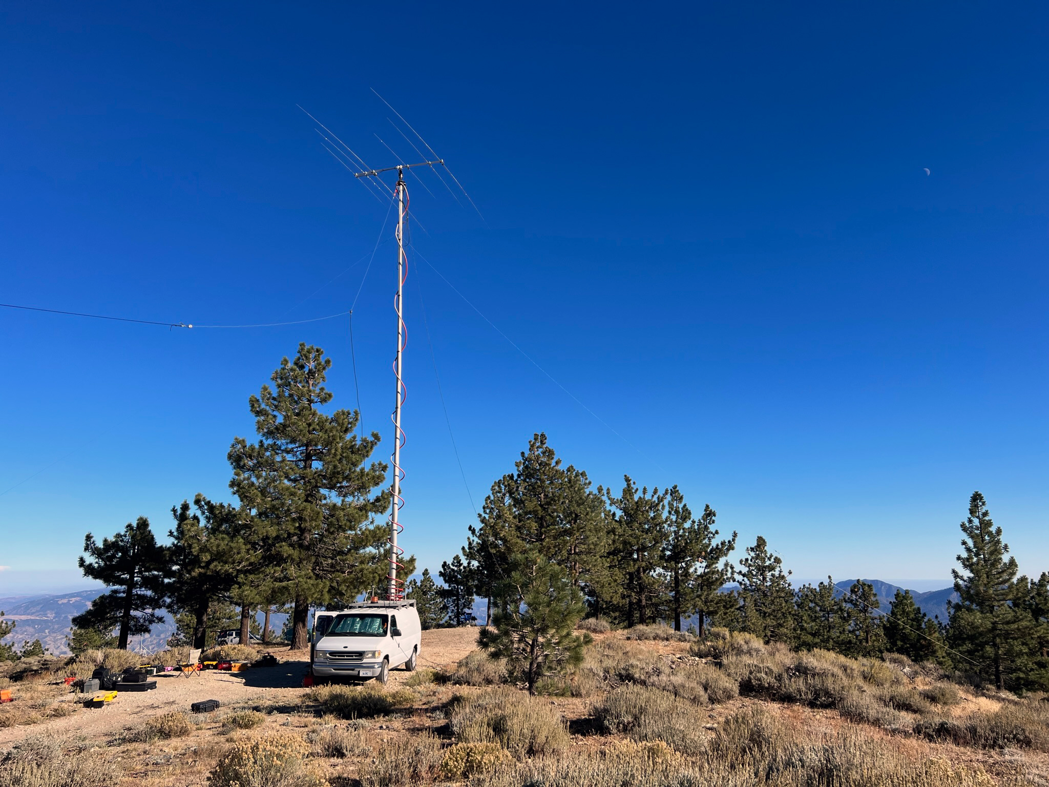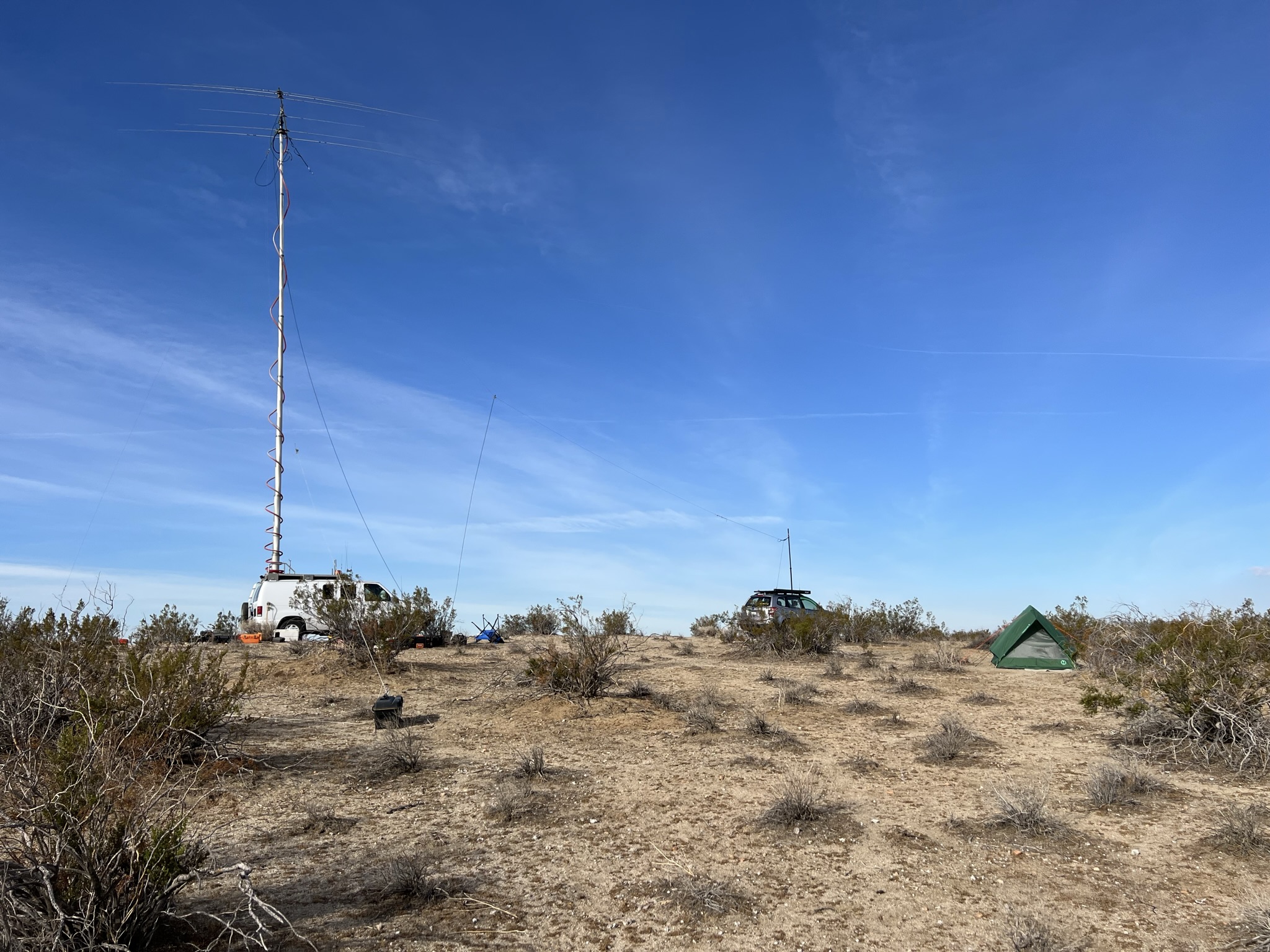 2023In May 2023, Jim and Sheila Forsyth hosted a multi-operator CQ Worldwide WPX Contest group at the AF6O station in DM14 (in in the California Mojave desert with thousands of blooming Yucca plants). This San Bernardino County station has a gentle downward slope toward Japan and Europe (good for low bands). We used the AF6O KT34A four element yagi at about 50 feet on 10, 15 and 20 meters. We used delta loops on 40 and 80 meters. Scott (N6MI) and Jim (AF6O) often operated as a team in the pileups; Jim's scratch paper could be an art project. Drew (N7DA) did a great job at the computer and paddle. Our raw results: 3.5 (16 contacts); 7 (280 contacts); 14 (507 contacts); 21 (419 contacts); 10 (25 contacts). The Yaesu FTdx101D waterfall was a great help with search and pounce. After adjudication, our final score was 1,238,292. We finished first in California (the Sixth Call Area) and tenth in North America. On June 10-11, 2023, N6MI and K6VCR went portable as "N6MI" from the Mojave Desert (near Fort Irwin, California) to hand out a few rare DM15 contacts during the ARRL VHF contest. We operated from a converted news van. We ran 500 watts (or less) on six meters to a five element yagi at 60 feet. We ran 100 watts on two meters for a handful of contacts. Before log checking, we worked 11 CW, 49 USB, and 156 FT8 contacts (almost all on six meters) -- 123 grids with contacts in the continental United States, Hawaii, Mexico, Canada, Ireland, Switzerland, and France. Six meters was booming on Sunday morning, but we packed up after the weather turned to hail and thunderstorms. We won the certificate for this ARRL division (Orange) in the Limited Multioperator class. On June 24-25, 2023, Tom's Garage ARC operated in the ARRL Field Day (call, N6MI) as 2A SJV from Tecuya Peak (6,850 feet at our camp) in Kern County, California (DM04mu). We finished sixth in the country out of 308 entries in Class 2A. We camped immediately next to a very busy dirt road, about two miles from pavement and a rural pizza takeout restaurant. The nearest town was Frazier Park, California. Our team included NB6E, N6MI, K6VCR, N7DA, KN6OGP, K1BTW, and Broden Weeks (a high school student, not yet licensed). KN6OGP came down with a bug just before the contest, but his assistance with logistics and early Field Day planning was very helpful to the group. The first station was set up in a converted television news van with a pneumatic mast. The van station covered 80 (long wire), 20 (3 element yagi at 60 feet), and 10 meters (sloping dipole). The van radio was a Yaesu FTdx101D. The van also housed a 2 meter and 440 MHz station using an Icom IC-9700 and two very short yagis. The second station was set up in K6VCR's trailer. This station covered 40 (two element yagi on a 50-foot army surplus mast) and 15 (three element yagi on a 28 foot push up mast). The radio was an Elecraft K3. The GOTA station was set up on a table under a canopy (classic Field Day style); the photo was used on the cover of the June 2024 QST magazine. This station was operated by K1BTW and his soon-to-be licensed son, Broden (a high school student); that's K6VCR wearing his GOTA coach face. N7DA also served as a GOTA coach. Broden worked New Zealand and Australia stations on 10 meters when he wasn't pumping out contacts to the Field Day crowd under the watchful eye of K1BTW. We were visited by about a dozen travelers. The weather was cold at night (in the 30s) but excellent (sunny, in the 60s) during the day. We made 2,059 contacts from the two main stations (the van and trailer). Our GOTA station also made 209 contacts — fantastic. Call: W6E, October 7-8, 2023