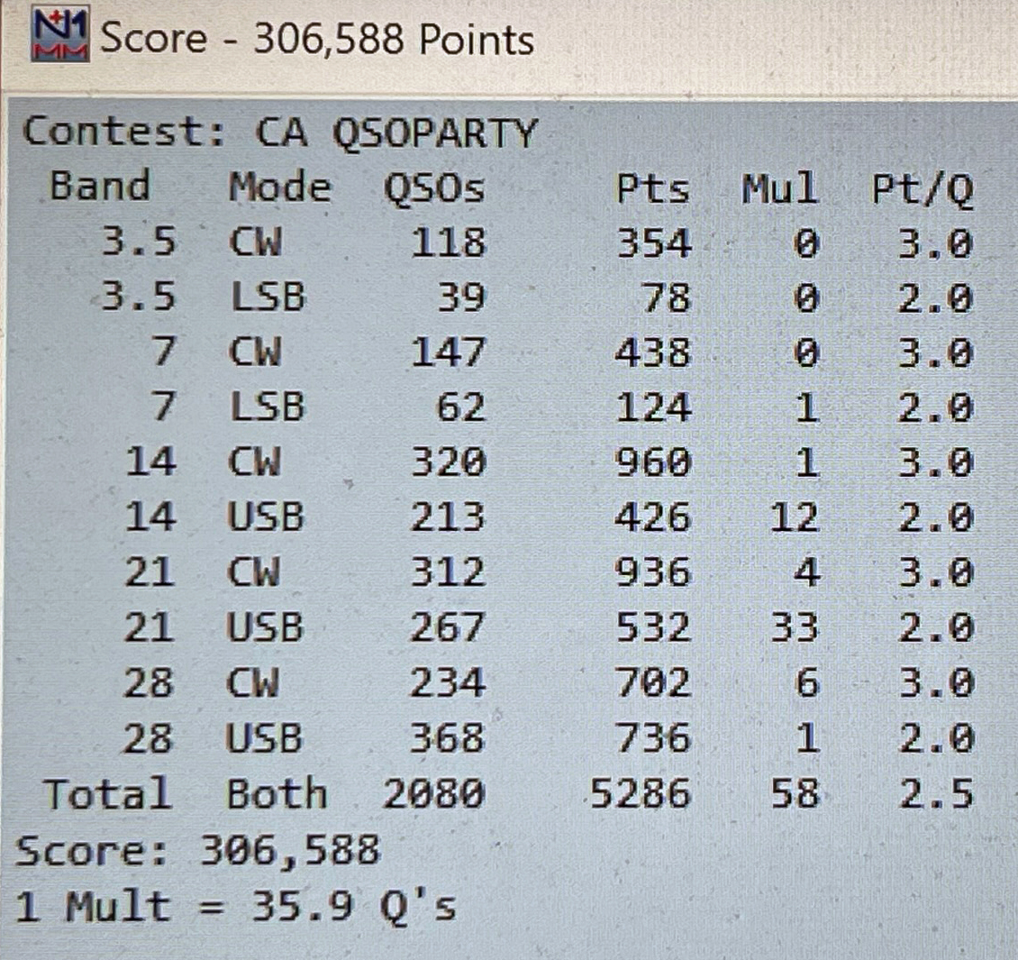 2024On May 25-26, 2024, Drew (N7DA) and Scott (N6MI) operated for 41.7 hours in the CQ Worldwide WPX Contest. We operated from the N6MI van in DM15aa on a Mojave Desert hill. Creosote bushes, grasshoppers, and (after dark) kangaroo rats were our only companions. In the Multi-One high power category, we finished #1 in the United States 6th call area and #12 in North America. The operating position is a bit crowded, but functional. We used a JK C3S-JK tri band antenna at 60 feet on the high bands (two elements on 20 meters, two elements on 15 meters, and two elements on 10 meters). This fine antenna is an upgraded Force 12 design. We "aimed" a 40 meter sloper toward Japan. We used an inverted vee on 80 meters. The weather was nice (about 79 degrees on Saturday and 86 degrees on Sunday, with lows around 52 degrees). The moon was full and very bright. The desert wind was unpredictable, blowing from zero to 35 miles per hour. 15 meters was open across the globe until the late evening. 20 meters never closed. 40 meters was excellent at night until the Chinese (?) over the horizon radar came on around 4:00 a.m. local time. We made contacts in about 92 DX countries: 32 contacts on 80 meters; 194 contacts on 40 meters; 387 contacts on 20 meters; 624 contacts on 15 meters; and 92 contacts on 10 meters. On June 8 and 9, 2024, Scott (N6MI) and Tom (K6VCR) operated in the unlimited multioperator class in the ARRL June VHF Contest from Frazier Peak, Ventura County, California (in the Los Padres National Forest). We camped in a converted television news van (n6mi.com) and Tom's tricked out off-road truck at 8,013 feet elevation (near the forest service sign on the peak). The weather was nice during the day (in the 70s) and cool at night (around 55 degrees). The ladybugs were everywhere. Radio conditions were poor. We used a Yaesu FTdx101D on 6 meters and an Icom-9700 on 2, 432, and 1296. We also used a Kenwood handheld on 223.5 FM. For antennas, we erected: a five element yagi at 60 feet on six meters; a 13 element yagi at 20 feet on two meters; an 11 element yagi at 10 feet on 223.5; an 18 element yagi at 15 feet on 432; and a 22 element yagi at ten feet on 1296. Before log checking, we made 258 contacts and logged 76 grids: 138 contacts and 35 grids on six meters; 72 contacts and 17 grids on two meters; 4 contacts and 3 grids on 223.5; 37 contacts and 15 grids on 432; and 7 contacts and 6 grids on 1296. We were First Place in the Santa Barbara Section and earned the top score in the unlimited multioperator class in the ARRL Southwestern Division. For Field Day 2024 (June 22-23), Tom's Garage ARC (N6MI) set up camp on Tecuya Mountain (Kern County, DM04, in the Los Padres National Forest). Our 2A SJV team included: Tom, K6VCR (president of the club); Drew, N7DA; Larry, NB6E; Chef, KN6OGP; Greg, KI6RXX; Shane, K1BTW; Broden (17 years old and promises to get his license soon); and Scott, N6MI. We set up right next to a smooth dirt road about 1.5 miles from the nearest pizza joint. (Thanks for the pizza, Drew.) Many folks drove by our operation. We were visited by a few strangers, one SOTA ham, two park rangers, and (by special invitation) a senior officer of the California Department of Fish and Wildlife. Off-duty hams were always available to chat with the visitors. One primary Field Day station was set up in Tom's trailer (40/15). The other primary station was set up in N6MI's converted television news van (80/20/10). Six meters was operated from KN6OGP's trailer. Two meters was operated from KI6RXX's truck. We did not put up a Field Day antenna on 160. We worked 5 hams on 80 CW, using 100 watts to an inverted vee. We worked 203 CW and 66 LSB contacts on 40 meters -- using 100 watts to an inverted vee. Tom said that he missed the two element 40 meter yagi we have used in prior years. We worked 641 CW, 1 FT8, and 341 USB contacts on 20 meters -- using 100 watts to a JK C3S triband yagi at 60 feet (two elements per band). This easy to assemble antenna was built on vehicle roof and placed on the pneumatic mast of N6MI's van. We worked 415 CW and 589 USB contacts on 15 meters -- using 100 watts to a six element yagi at about 50 feet (on an AB-577 mast). Yep, six elements. Sweet. We worked 26 CW and 47 USB contacts on 10 meters -- using 100 watts to the JK C3S triband yagi at 60 feet. Ten meters was tough going. We worked 43 FT8 contacts on 6 meters -- up to 100 watts to a five element yagi at about 20 feet. Six meters never opened up. We worked three FM stations on 2 meters. We ran a GOTA station (call sign, N7DA). Shane and Drew made 389 contacts -- using 100 watts and a multi-band Alpha Delta dipole. The GOTA station was set up on a card table under a pop-up canopy. N7DA served as the coach. (Those GOTA folks earned a little nap time.) Did I mention the food? Chef set up a great spread for Friday's lunch and dinner. Then he cooked waffles on Saturday morning -- apples, strawberries, authentic maple syrup, and whipped cream were available. (Next Field Day, how about fresh squeezed orange juice? Just kidding, Chef. But seriously, how can you beat a waffle breakfast?) In Field Day 2024, we earned sixth place nationally in the very competitive 2A category. On July 13-14, 2024, Paul (W6PNG) and Scott (N6MI) operated a 500-watt transmitter in the IARU HF World Championship as N6MI (the call). We used the Yaesu FTdx101D and an Acom amplifier. Our QTH was Frazier Peak, Ventura County, California (grid square DM04ms). We operated in the Los Padres National Forest in the N6MI ham radio van (n6mi.com) and rested in Paul's tricked out Jeep. We powered the station with a Honda generator, Field Day style. We used a tri band JK antenna on 10/15/20 meters at 60 feet. JK makes an easy antenna to transport and assemble on the roof of the van. We used inverted vees on 40/80 meters. Radio conditions were excellent (10.7 cm flux 205, A index 5, K index 2) on the low bands. It was crowded -- hard to maintain a frequency for c