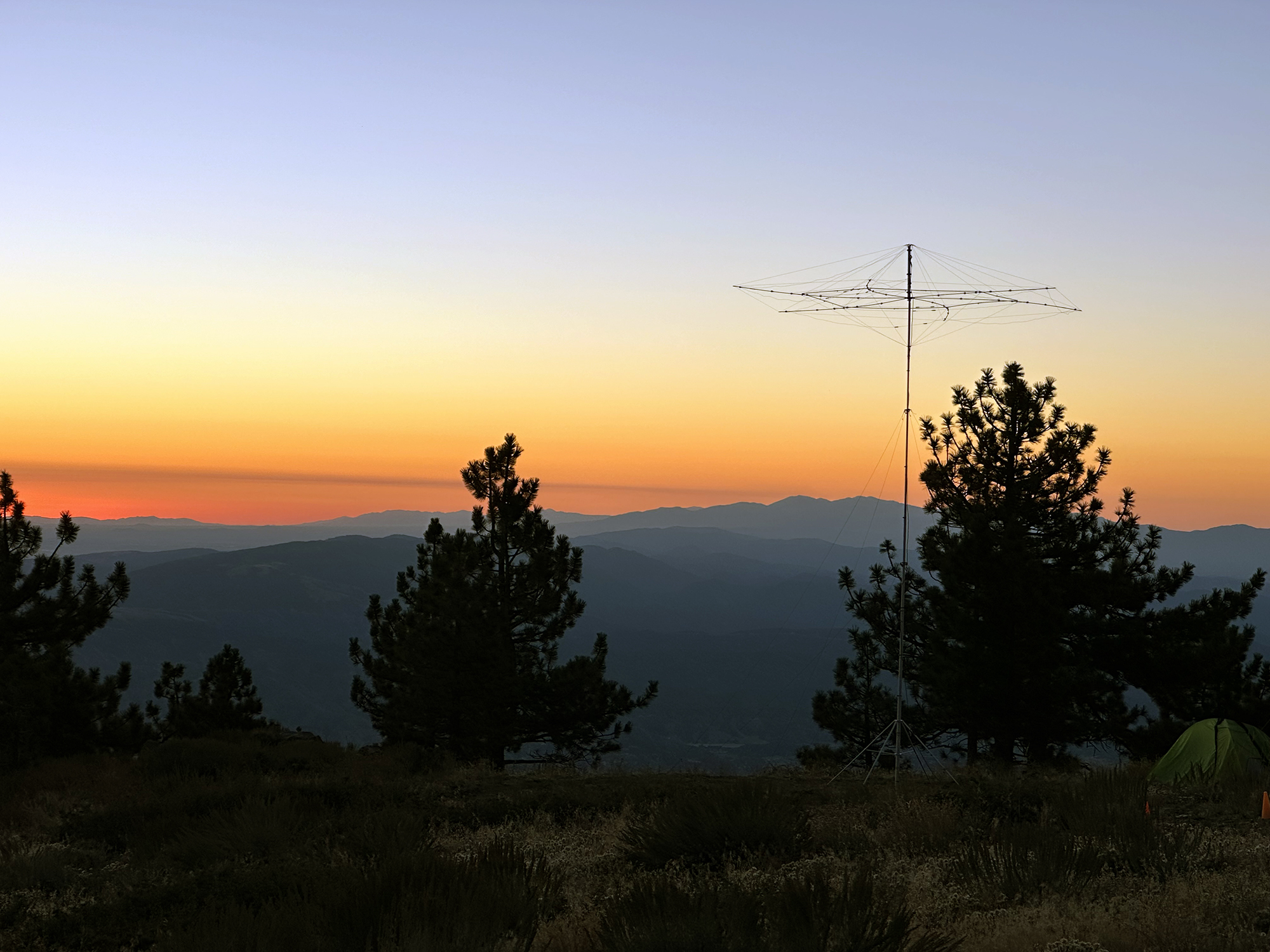 18 element yagi on 432 at 15 feet (75 watts), can’t even count the number of elements on the yagi on 1296 at 20 feet (10 watts). The results: June 2021 Field Day (Frazier Peak, DM04ms, Class 2A Santa Barbara, 2,358 contacts). We finished seventh in the nation out of 277 entries in the very competitive Class 2A. The team included K6VCR, N7DA, NB6E, N6MI, K1BTW, Broden Weeks, plus our GOTA operator. We used an inverted vee on 80 meters (106 CW, 56 FT8, 28 LSB contacts), a two element yagi on 40 meters at 50 feet (401 CW, 787 LSB contacts), a three element yagi on 20 meters at 60 feet (790 CW, 7 FT8, and 145 USB contacts), a three element yagi on 15 meters at 25 feet before it blew over (14 CW, 1 USB contacts), a three element yagi on 10 meters at 20 feet (not used), a 6 meter loop (not used), and a 6 element yagi on 2 meters at 8 feet (1 CW and 1 FM contact). Our GOTA station used a spider beam at about 20 feet (22 USB contacts, mostly on 15 meters). The sunrise on Sunday was pretty. K1BTW and Broden Weeks (BNinja Productions) produced a fun documentary of the 2021 Field Day operation. Contact me if your club needs a speaker on "Field Day in the mountains." October 2021 California QSO Party (Frazier Peak, Ventura County, DM04ms, using special call W6E, with W6PNG on SSB and N6MI on CW). 1,243 contacts, 57 multipliers, 179,208 points. Number 1 in Ventura County, number 7 in California, in multi-single high power category. The sunrise is always special on Frazier Peak. The weather was perfect and the wind was light.