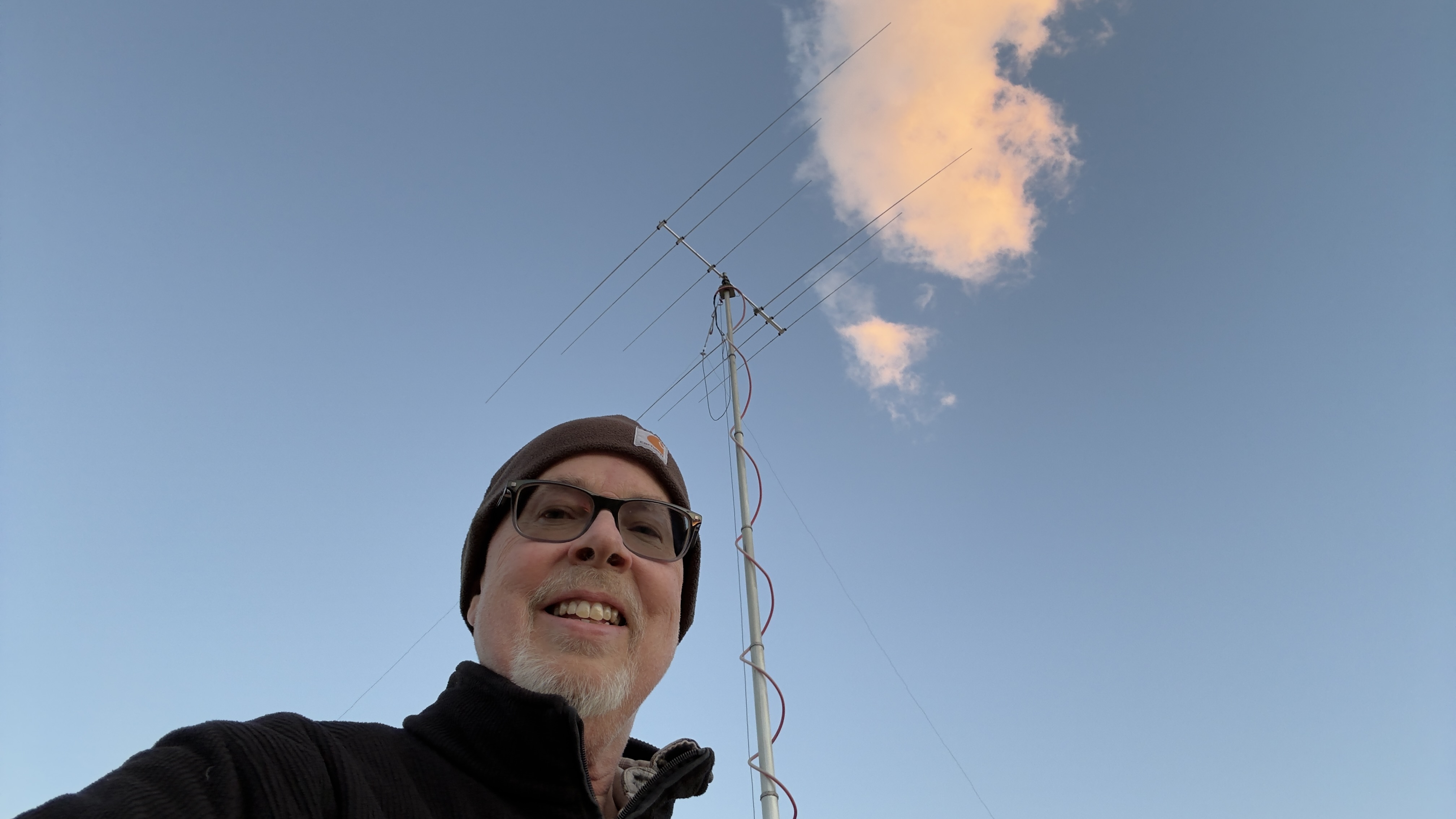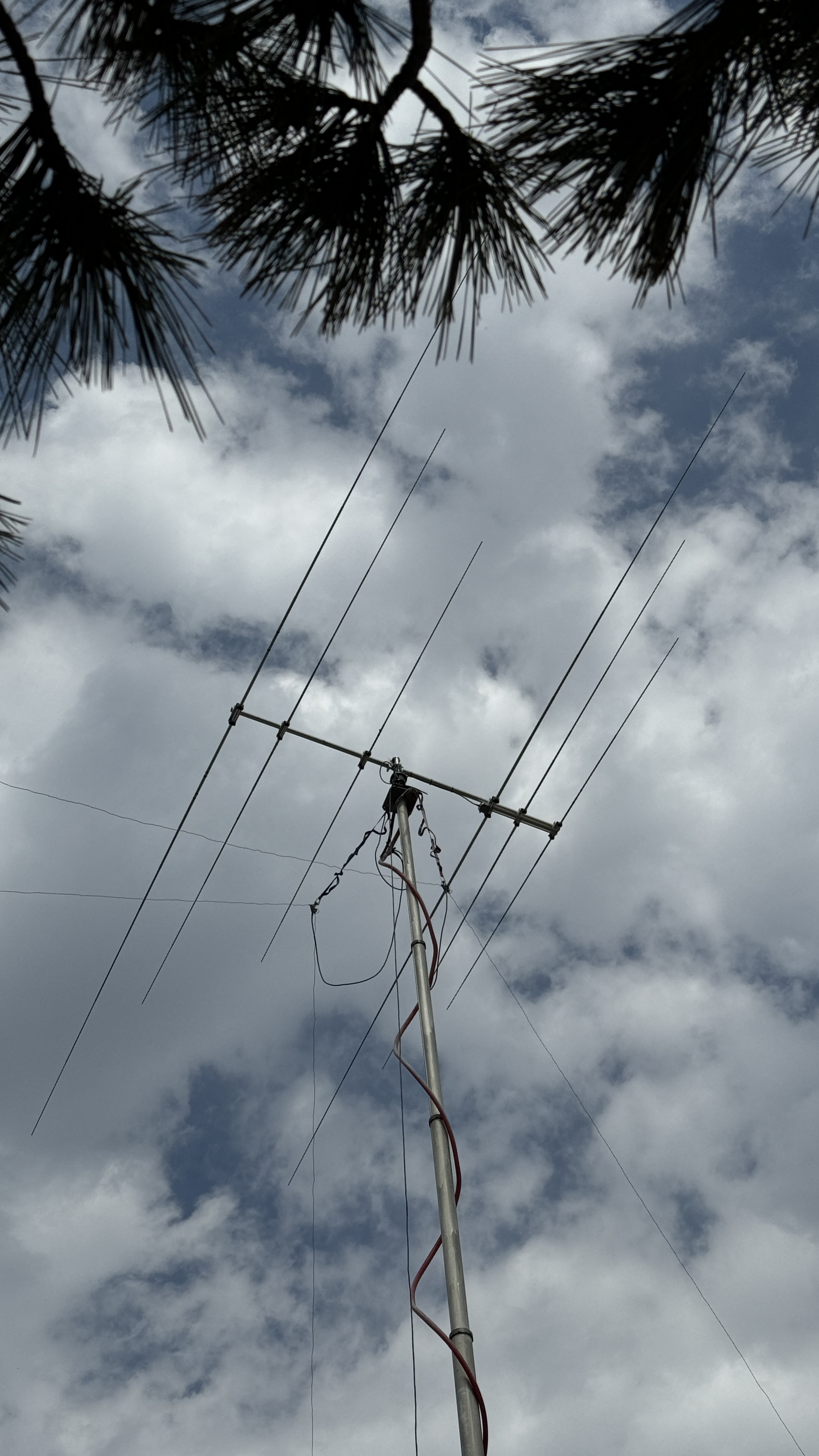 Wind, 0-40 MPH (can’t keep a hat on). 5 element yagi on six at 60 feet (500 watts),